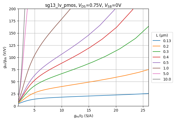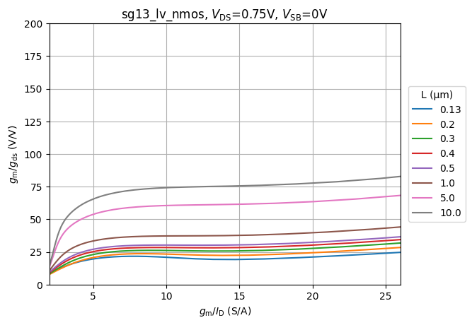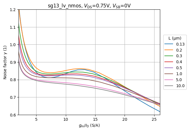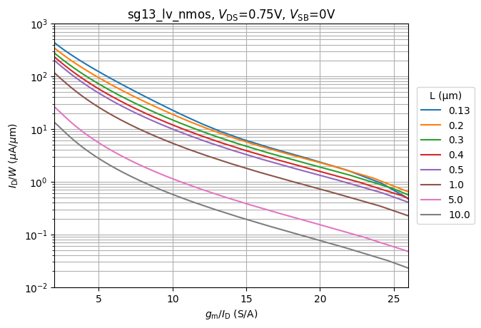 Unfortunately, this focus on a “special” source has made its way into some MOSFET compact models. The model that is used in SG13G2 luckily uses the PSP model, which is formulated symmetrically with regards to drain and source, and is thus very well suited for analog and RF circuit design. For a detailed understanding of the PSP model please refer to the model documentation.