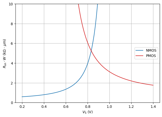 operating voltage (nom.) \(V_\mathrm{DD}=3.3\,\text{V}\), \(L_\mathrm{min}=0.45\,\mu\text{m}\), \(V_\mathrm{th}\approx -0.65\,\text{V}\) |