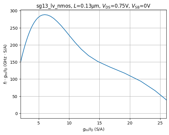 plt.xlabel(r'$f_\mathrm{T} \cdot g_\mathrm{m}/I_\mathrm{D}$ (GHz $\cdot$ S/A)')