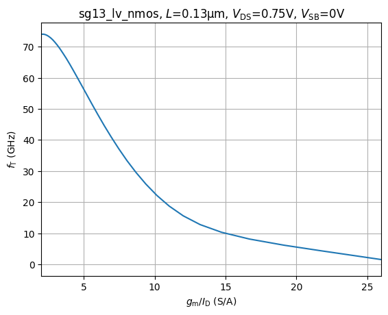 plt.show()"techsweep_sg13_plots_nmos_overview/plots/NMOS_fT_gmID.eps", bbox_inches='tight') fig.savefig(