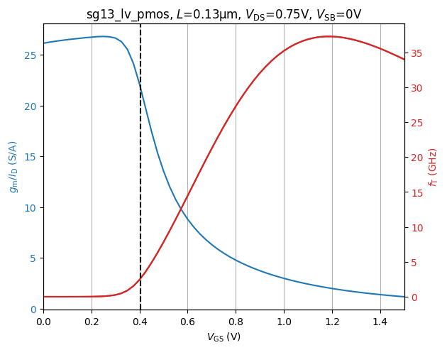 plt.show()"techsweep_sg13_plots_pmos_overview/plots/PMOS_gmID_fT_VGS.eps", bbox_inches='tight') fig.savefig(