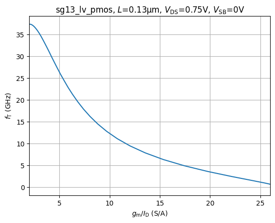 plt.show()"techsweep_sg13_plots_pmos_overview/plots/PMOS_fT_gmID.eps", bbox_inches='tight') fig.savefig(