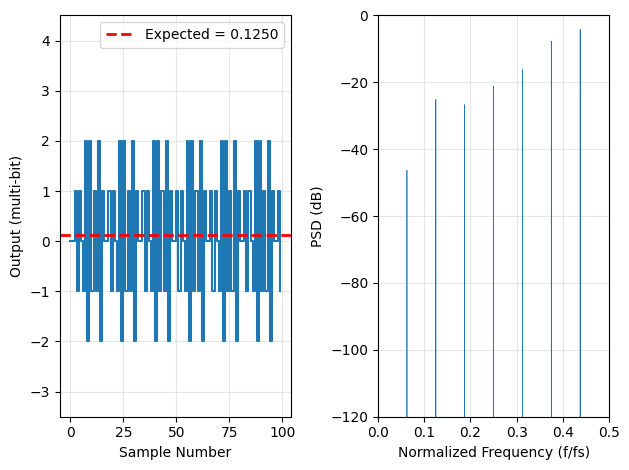 This notebook implements a 3rd order MASH (1-1-1) modulator that converts a constant input value (0-1) into a multi-bit sequence. The output shows the time-domain sequence, individual stage outputs, and its spectrum via FFT.