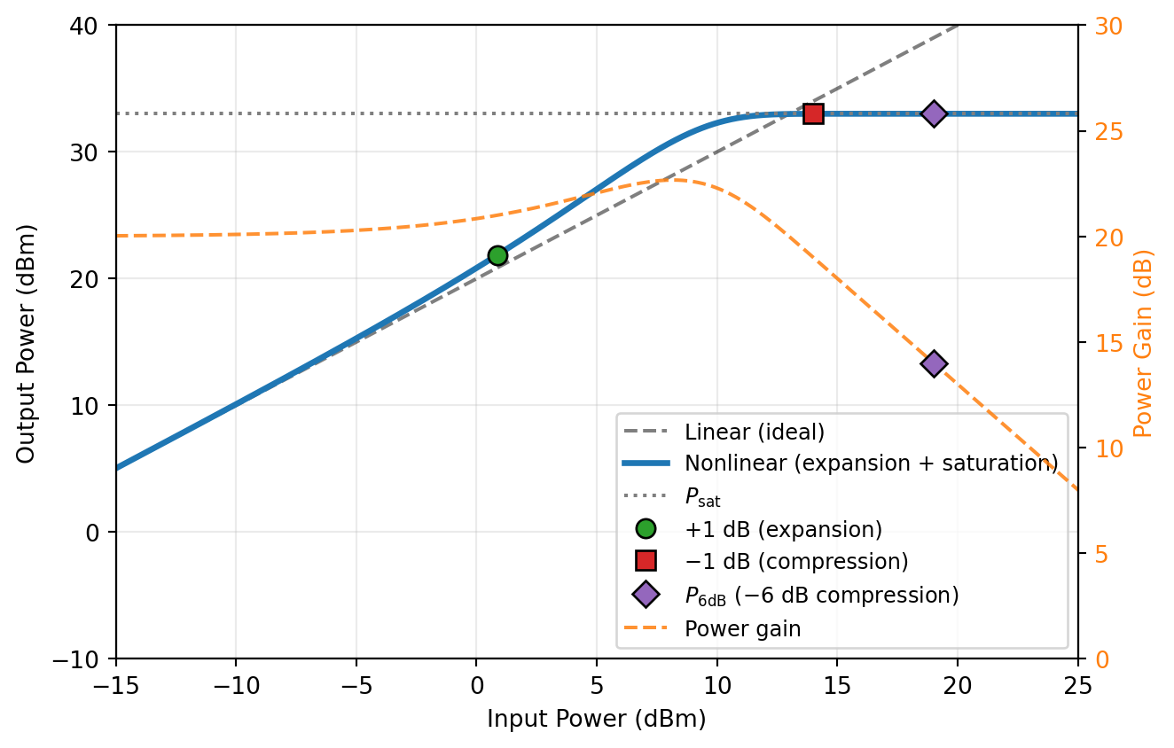 As we have already seen in Section 1.1, the transmitter has to process large signals without distorting them, while the receiver has to process small signals in the presence of large signals. Both situations mean we need metrics and models to quantify and discuss linearity properties.