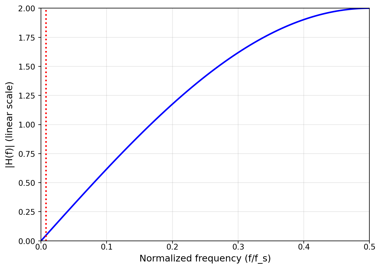 \[ S_\mathrm{y}(f) = S_\mathrm{q}(f) |H(f)|^2 = S_\mathrm{q}(f) \cdot 2 \left| 1 - \cos(2 \pi f T_\mathrm{s}) \right| \implies H(f) = \sqrt{ 2 \left| 1 - \cos(2 \pi f T_\mathrm{s}) \right| }. \]