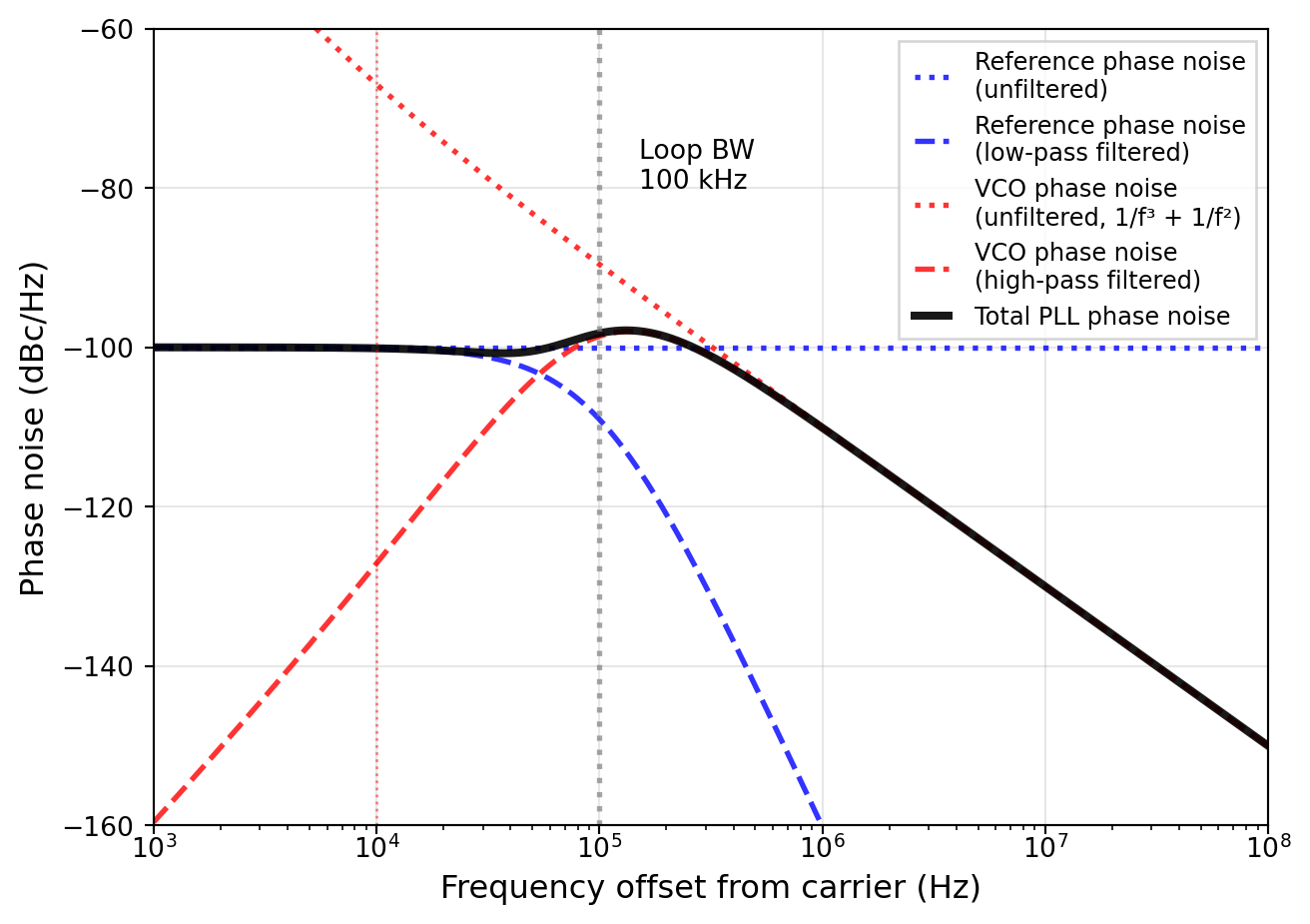 This periodic switching introduces spurious tones in the PLL output spectrum at multiples of \(f_\mathrm{ref}/100\), which can potentially pass through the loop filter and appear in the output spectrum, degrading the signal quality.